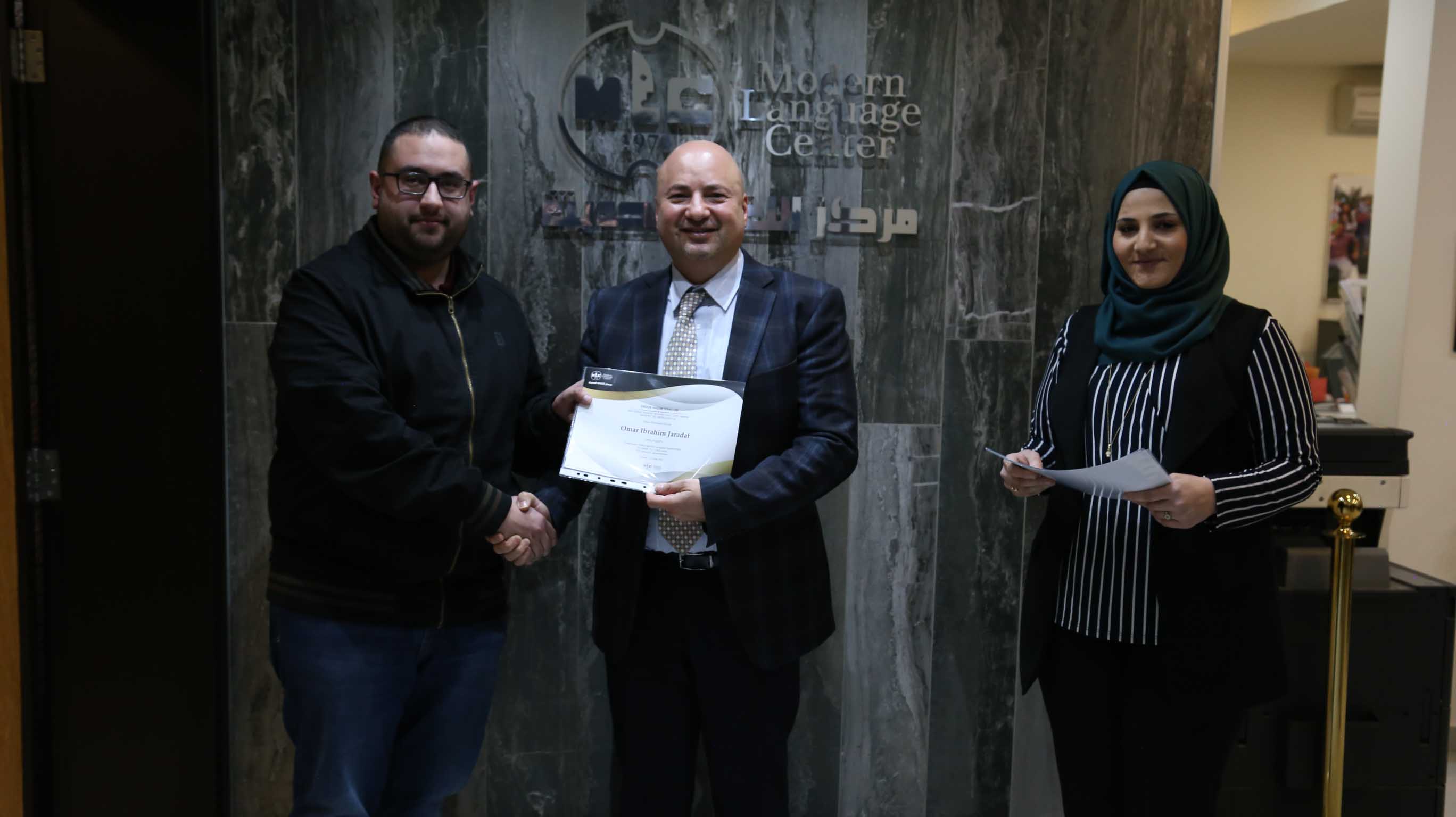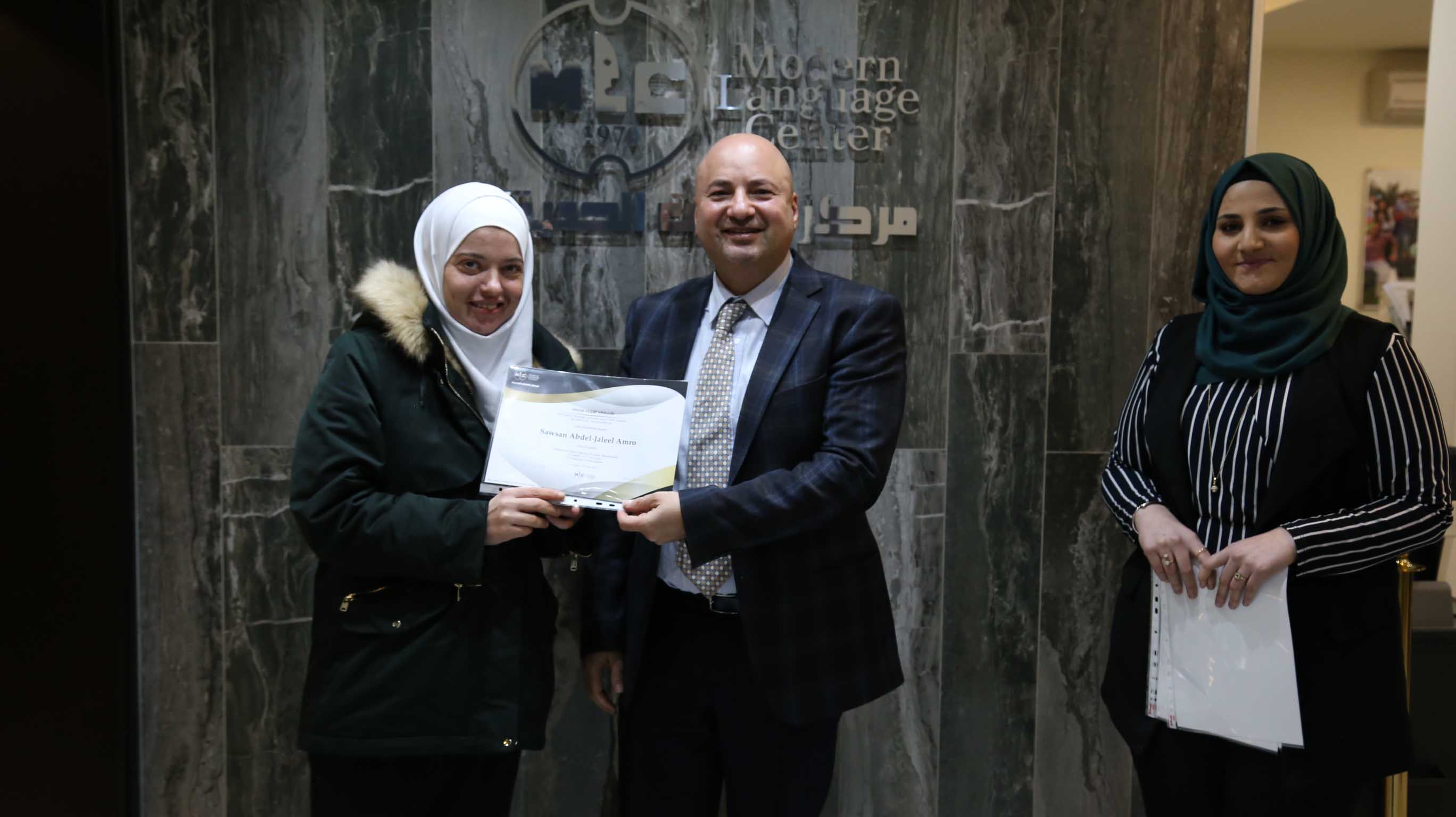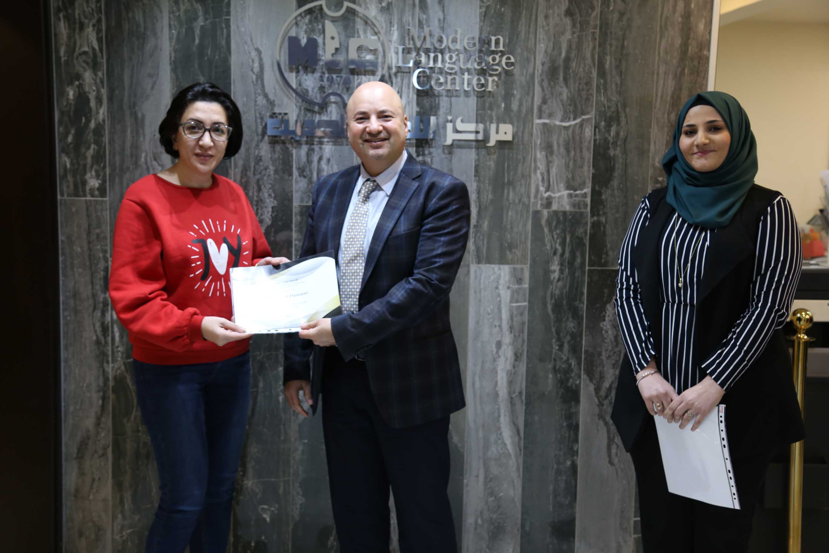 هذا وقد قام الأستاذ فارس عوض مدير مركز اللغات الحديث بتسليم الشهادات على مستحقيها ضمن حفل في مقر المركزالكائن في جبل اللويبدة خلف البحث الجنائي.